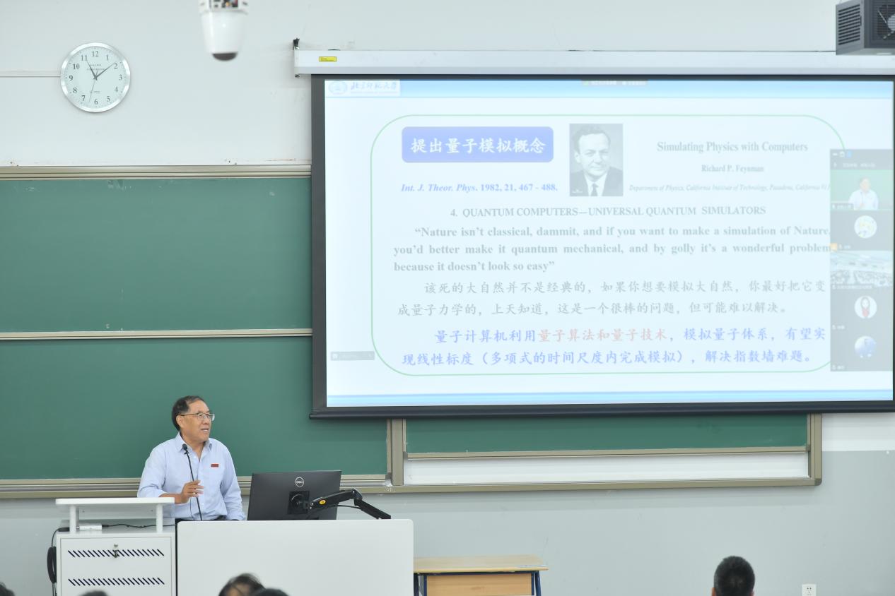 方维海院士从量子模拟的起源出发,介绍量子计算机与经典计算机的差异,探讨量子计算机的优势,同时也为同学们讲解了量子计算机在化学领域的应用。在量子计算机和经典计算机的对比中,方老师介绍到传统计算机以经典比特为基本单位,而量子计算机以量子比特为基础,这种差异赋予了量子计算机异乎寻常的计算能力。他还以模拟多并苯紫外/可见吸收谱为例,生动地说明了量子计算机在解决复杂化学问题上的卓越表现。通过深入浅出的讲解,同学们了解到量子模拟作为一项探索微观世界的强大工具,也对量子科学的重要性有了更加清晰的认识。