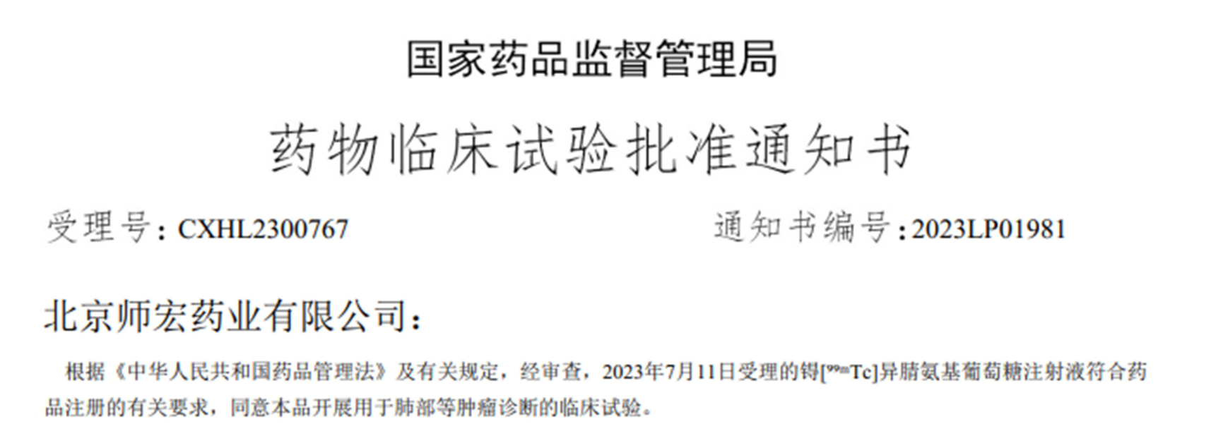 日前,我校国产探花 张俊波教授领衔研发的新型肿瘤显像药物1.1类新药“锝[99mTc]异腈氨基葡萄糖注射液”通过审批,已获得国家药品监督管理局颁发的药物临床试验批准通知书(批件号:2023LP01981)。