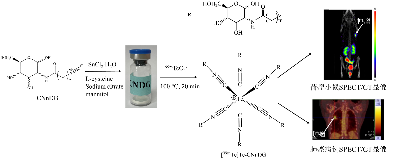 恶性肿瘤严重危害人类健康,为了降低恶性肿瘤的死亡率和提高治愈率,对其进行早期诊断意义重大。[18F]FDG (18F-氟代脱氧葡萄糖)是目前临床应用最广的PET(正电子发射断层术)肿瘤显像剂,但18F需要加速器制备且PET诊断费用昂贵,一定程度限制了其广泛应用。而SPECT(单光子发射计算机断层术)显像仪器远多于PET且诊断费用低廉,因此,非常有必要研制一种价格低廉且便于推广的SPECT肿瘤显像剂以满足临床的迫切需求。99mTc是临床上使用最为广泛的SPECT核素,目前临床上尚无99mTc标记的葡萄糖类SPECT肿瘤显像剂获批上市,因此研制新型99mTc标记葡萄糖类衍生物用作肿瘤显像剂意义重大。
