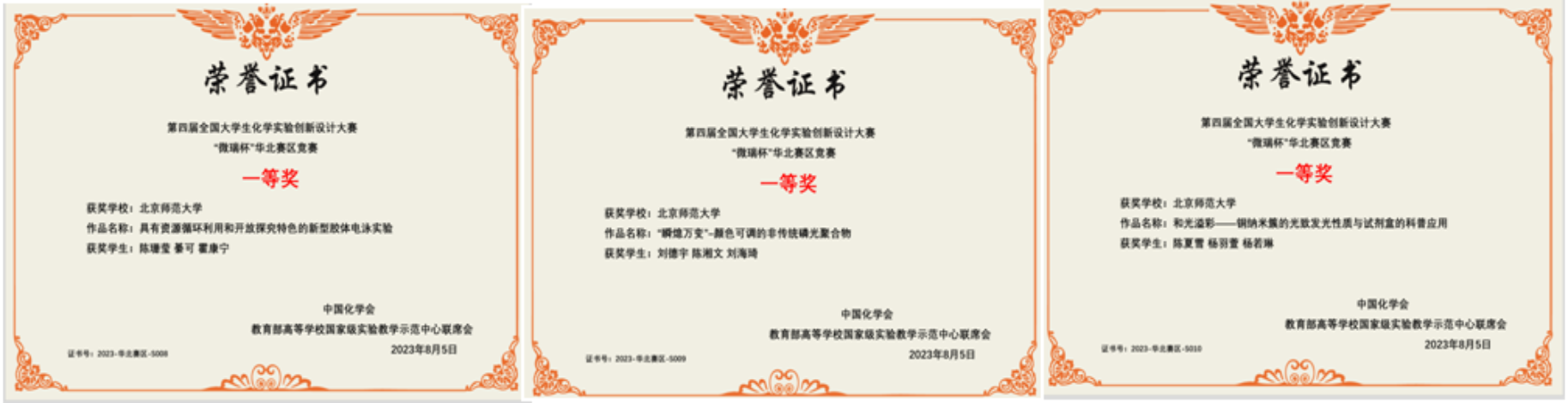 2023年8月20日-23日,“微瑞杯”第四届全国大学生化学实验创新设计大赛总决赛在浙江大学举行。本次总决赛由中国化学会、教育部高等学校国家级实验教学示范中心联席会主办、浙江大学化学系承办;由各分赛区推荐的90支优秀代表队(来自全国90所高校)参加了本次总决赛的角逐;这90支队伍是从全国1076支参赛队中经层层择选选拔而出。总决赛仍分新创实验、改进实验、科普实验三个赛道,采用作品书面评审和现场答辩的方式进行,在为期一天半的时间里,大赛进行了两轮答辩,各参赛队伍紧扣“创新、设计”主题,充分利用PPT讲解、现场演示等多种形式展示作品。评审专家逐一进行提问点评,并从适合性、科学性、创新性等多维度对参赛作品进行评审。经过激烈比拼,最终评出特等奖18项,一等奖32项,二等奖40项。