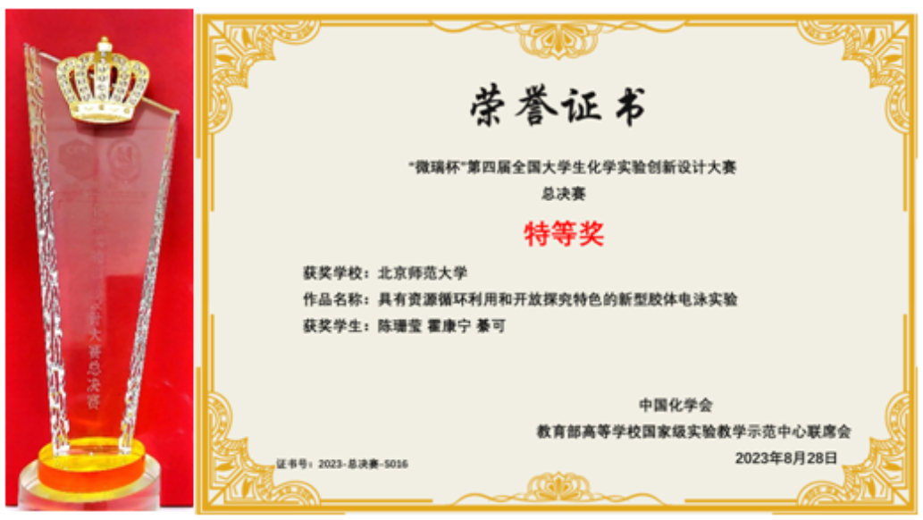 陈珊莹团队的改进实验作品“具有资源循环利用和开放探究特色的新型胶体电泳实验”,凭借巧妙的创意和精彩的阐释在总决赛中斩获特等奖。截至目前,在已举办的四届全国大学生化学实验创新设计大赛总决赛中,我院代表队已三获特等奖殊荣,总体成绩突出。本次大赛不仅是对参赛同学的一次锻炼、一次成长、一次收获,也为推动国产探花 实验教学改革、提升国产探花 本科生的创新意识、创新热情、实践能力,提供了有利的契机。