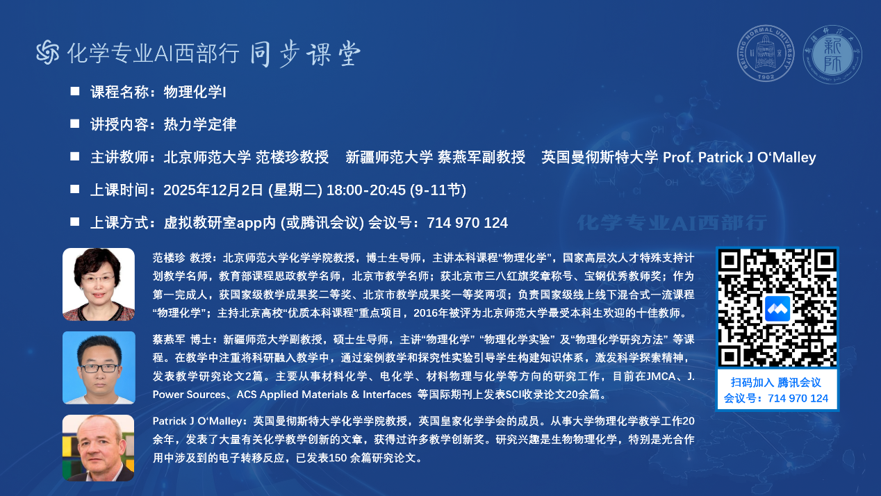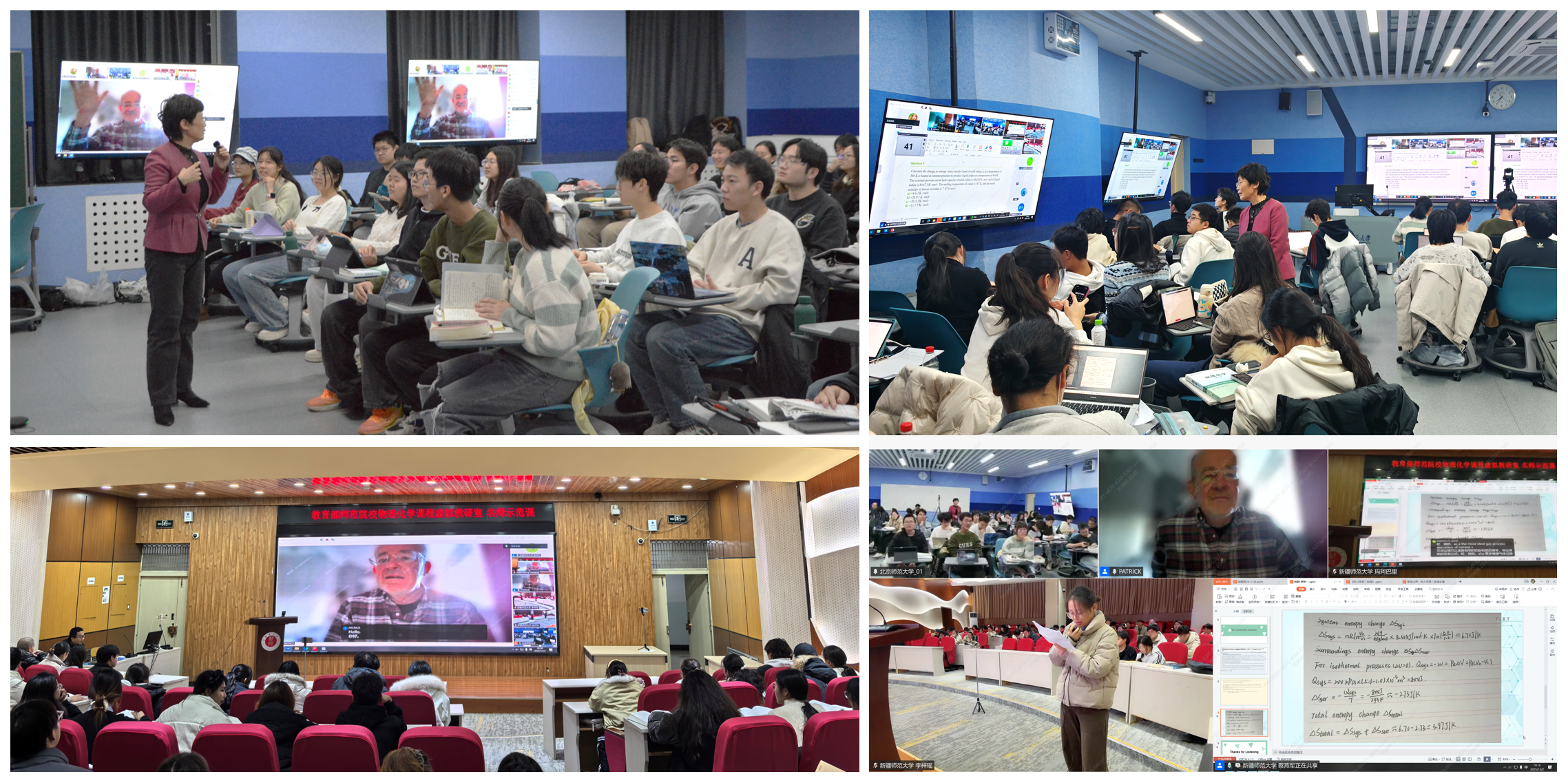 在同步课堂的第一阶段,英国曼彻斯特大学的Patrick J. O’Malley教授围绕热力学核心内容进行了全英文专题讲授,聚焦热力学三大定律,详细总结了熵、吉布斯自由能与化学反应自发性和平衡的原理。与往年最大的不同在于,新疆师范大学的学生不再是屏幕前的“旁听者”,而是成为了课堂的“主角”。在O’Malley教授的引导下,两校学生通过移动端实时同步回答问题,针对共性错题,O’Malley教授进行了现场深度解析。新疆师范大学的同学们与曼彻斯特大学的教授进行全英文问答互动,现场气氛热烈,真正打破了时空壁垒,实现了深度的课堂融入。