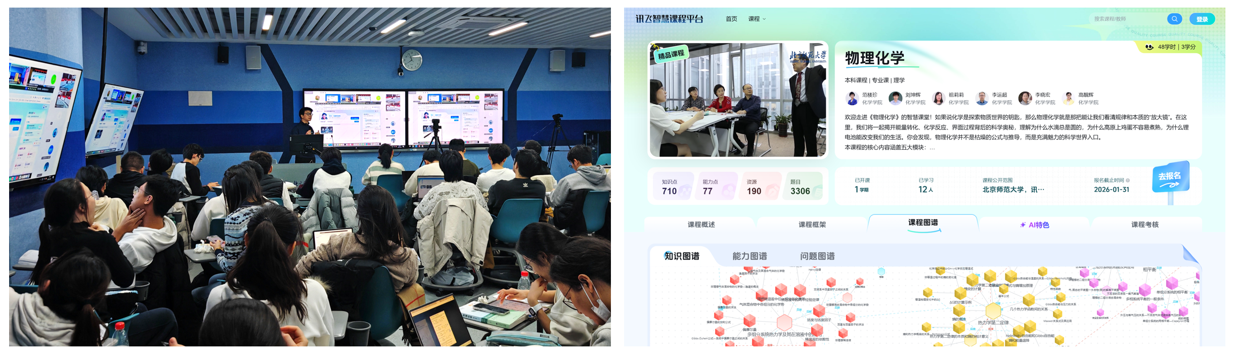 本次同步课堂依托国产探花 在科大讯飞平台建设的“物理化学”智慧课程。该课程集成了慕课视频、电子教案、全景式知识图谱、AI助教及智能批改等前沿模块的智能化教学空间,以“教、学、管、评、测”一体化的方式支撑课程的跨校共享与混合式教学,被平台推选为院校精品课程。同步课堂前,国产探花 范楼珍、刘坤辉老师与新疆师范大学蔡燕军老师依托智慧平台开展协同备课。通过平台数据,双方教师精准掌握了学生的预习情况,共同研讨教学设计,确定翻转课堂展示主题,实现了“跨区域同备一堂课”,为课堂的顺利实施奠定坚实基础。学生在预习阶段遇到的疑难问题,通过基于课程知识库的AI助教得到了实时专业的解答。基于共建共享的智慧课程,国产探花 作为“化学专业AI西部行”项目参与高校,使课堂从传统的单向知识传递,逐步转向高互动、高参与、数据驱动的智慧教学形态,为多校协同开课提供了可复制经验。