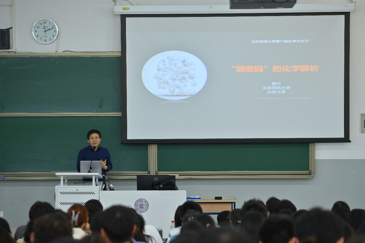 随后,陈兴教授作了题为“‘糖密码’的化学解析”学术报告。以“细胞组成生命体”引入,层层渐进地阐述了糖质、生物正交化学标记/点击化学的相关概念和应用;以生动形象的比喻向同学们展示了糖质与细胞的关系,列举了与糖质有关的生物学功能,深入浅出地引导师生认识糖质的重要作用;同时也介绍了生物正交化学标记技术及其在众多领域中的应用,如癌症早期检测和治疗方法的发展、神经突出信号传递等。在互动环节,师生们聚焦“糖在医学领域的研究与突破难点”等主题踊跃提问,陈兴教授详细解答,让大家对此方向有了更为清晰的认识。整场报告从理论到实践对“糖密码”作了全解析,带领同学们深入理解化学研究的前沿领域。