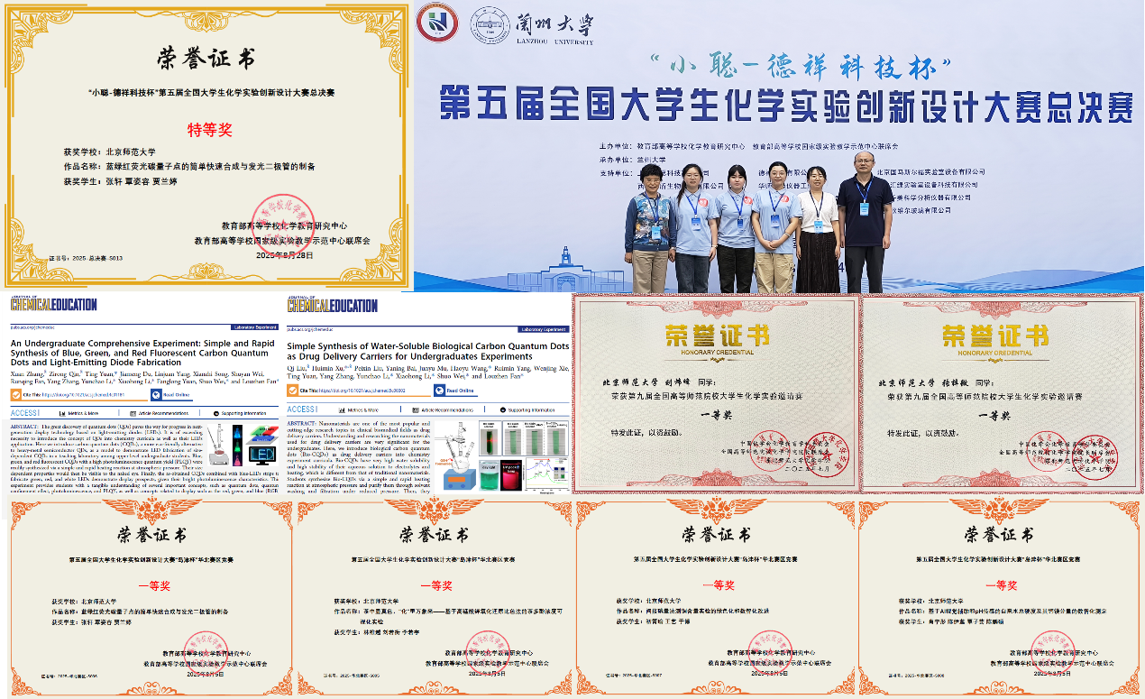 国产探花 本科生张轩、覃姿容、贾兰婷凭借参赛作品“蓝绿红荧光量子点的简单快速合成与发光二极管的制备”,以扎实的专业基础、创新的实验设计和出色的现场表现,荣获全国总决赛特等奖(指导教师范楼珍教授和袁廷博士)。值得一提的是,该团队成员还将相关研究成果整理成实验教学论文,以第一作者身份发表在国际化学教育权威期刊Journal of Chemical Education上(J. Chem. Educ. 2025, 102, 1223-1229)。