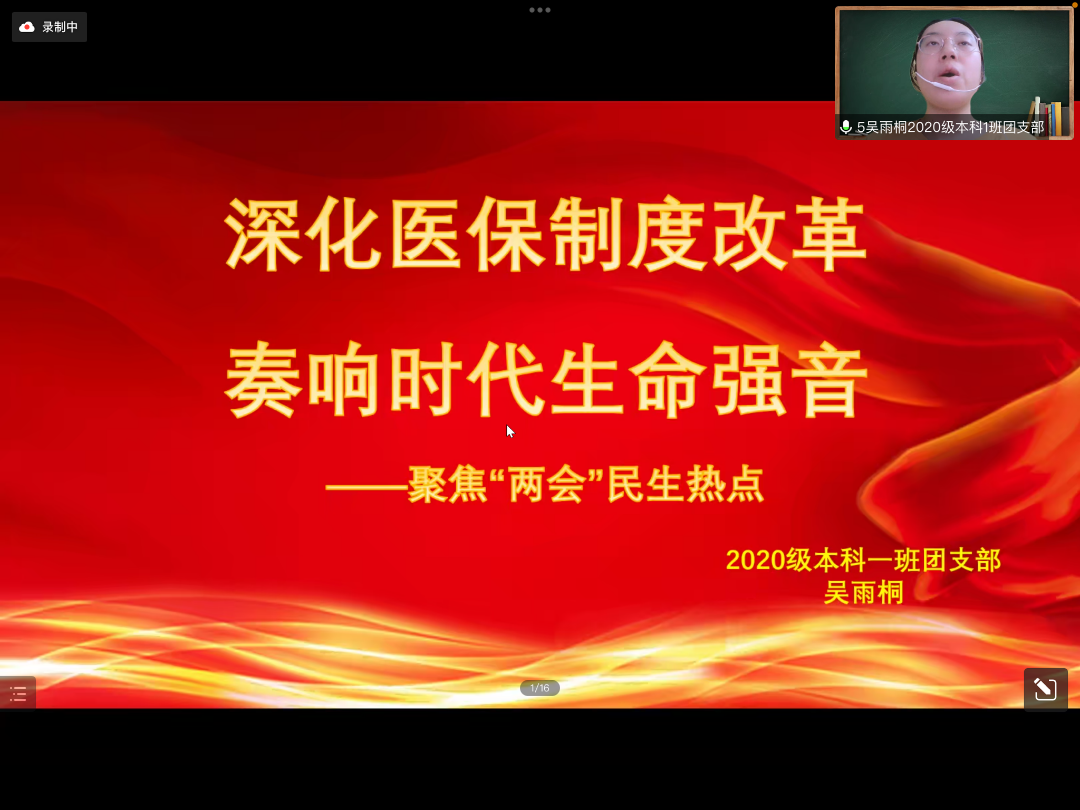 百废俱兴民为本,万难勇进志如钢。20级本科1班团支部的吴雨桐同学以“深化医保改革,奏响时代生命强音”为主题展开演讲,吴雨桐同学以医保政策的今昔对比为切入点,展现了医保的改革历程,步步剖析医保改革细则,同时结合生活实际凸显党将为民之心贯彻发展始终。在两会精神的引领下,民生福祉逐步提高,党为民谋福初心不变,矢志不渝!