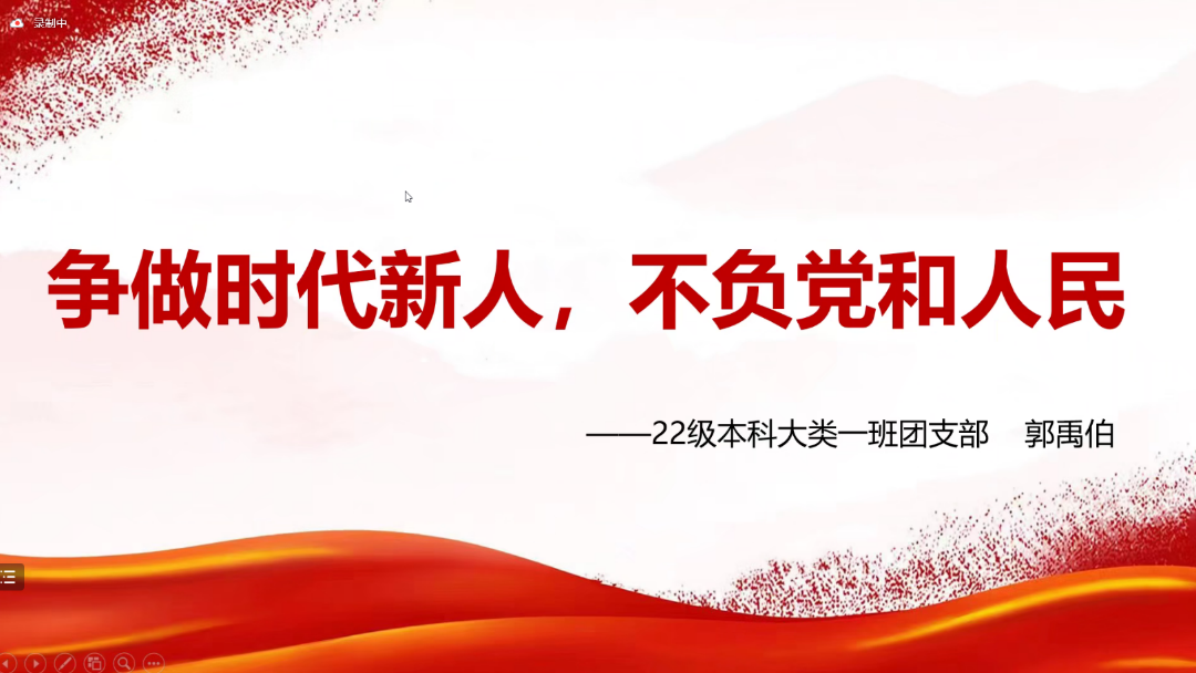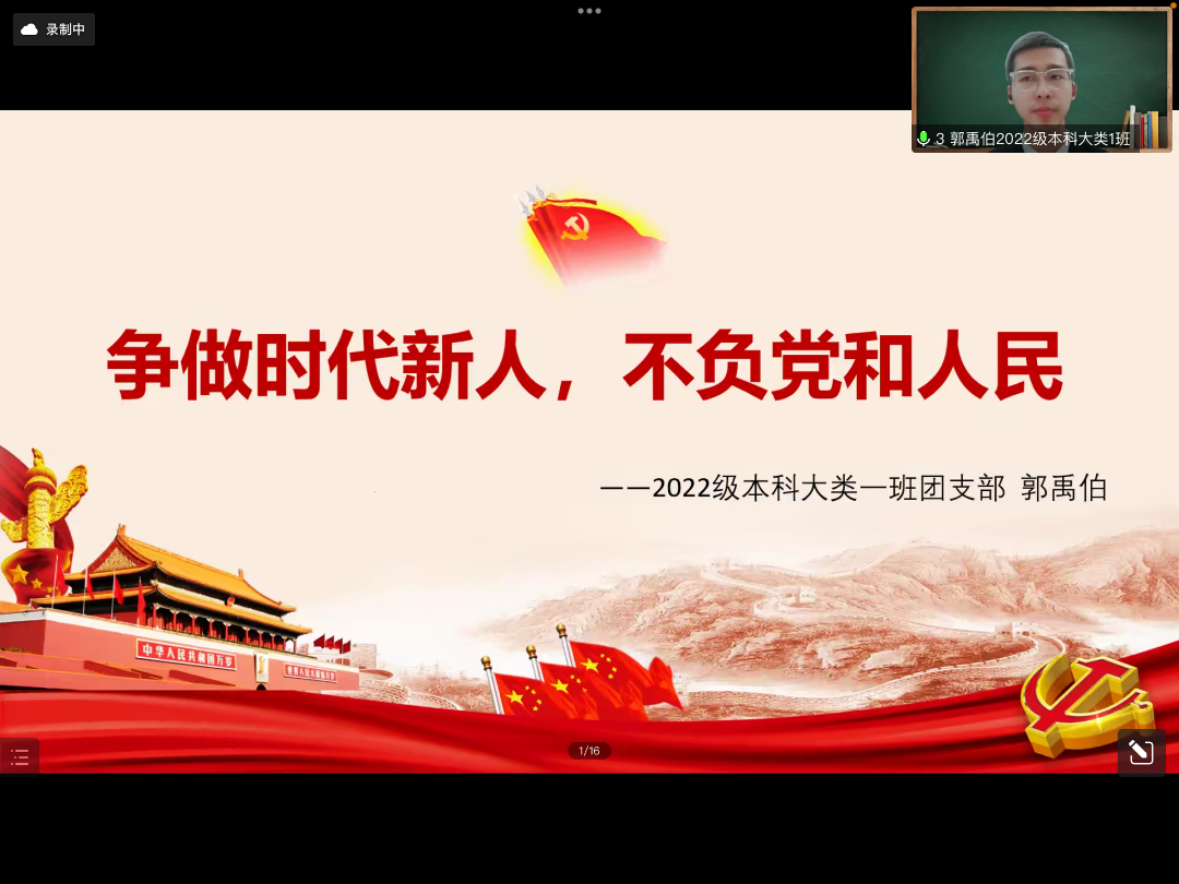 少年何妨梦摘星,敢挽桑弓射玉衡。22级本科大类1班团支部的郭禹伯同学以“争做时代新人,不负党和人民”为主题展开演讲,郭禹伯同学以习总书记考察中国人民大学为切入点,忆往昔岁月,李大钊先生以其青春热忱柔化地球之白首;看今朝盛世,新时代青年以其笃实坚定担当家国之责任。在演讲中郭禹伯同学用铿锵的语调,昂扬的姿态展现了历史使命薪火相传,代代青年初心不改,让同学们明白作为新时代青年要潜心治学,以奋斗驱萧索,谱时代之华章!