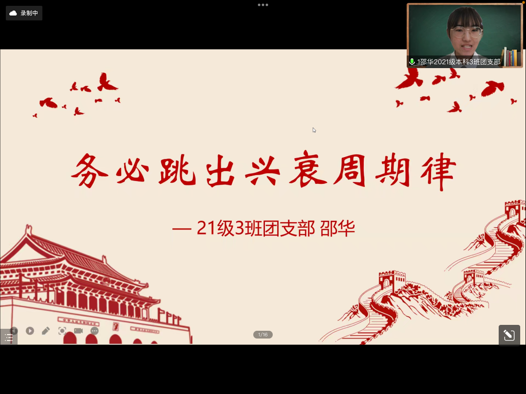 华夏千年梦未央,阔步新程岁月长。21级本科3班团支部的邵华同学以“务必跳出兴衰周期律”为主题展开演讲,在演讲中邵华同学以“三个务必”为切入点,讲述了七十年以来共产党人为人民奋斗的情怀。艰难困苦,玉汝于成,党用伟大奋斗创造了百年伟业,乘势而上,党必将夺取更伟大的胜利。邵华同学目光坚定,用清亮的声音号召同学们在这奔涌向前的新征程上,奏出新时代的青春交响,不啻微芒,造炬成阳!