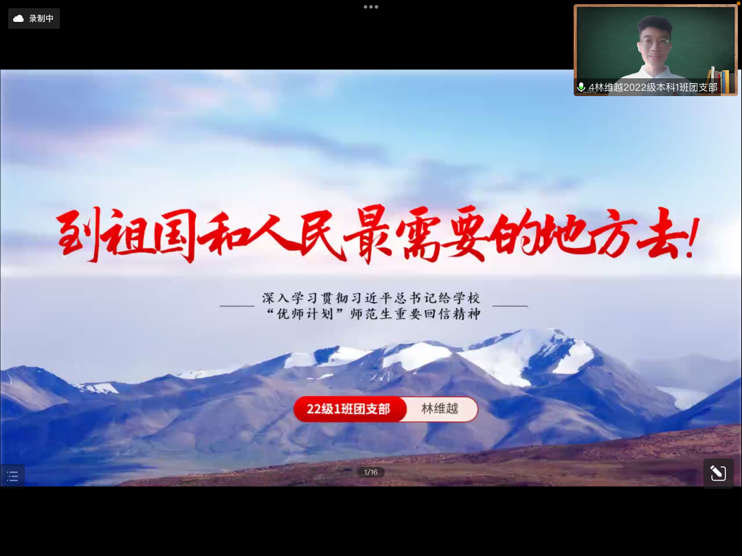 治学修身乐为公,薪火相传志恢弘。22级本科1班团支部的林维越同学以“到祖国和人民最需要的地方去”为主题展开演讲,讲述一代代师大人和光同尘,用行动诠释着“优师精神”,用满腔热忱将教育的光洒向山区,让清脆的读书声穿越杂乱的岩石。演讲中林维越同学从容不迫,用充沛的情感诉说着北师大人在教育的前沿播撒希望,在“优师”的潮头继往开来,让同学们更加深刻理解何谓“学为人师,教化从容;行为世范,砥砺无穷”,鼓励同学们书写自己与师大的故事。