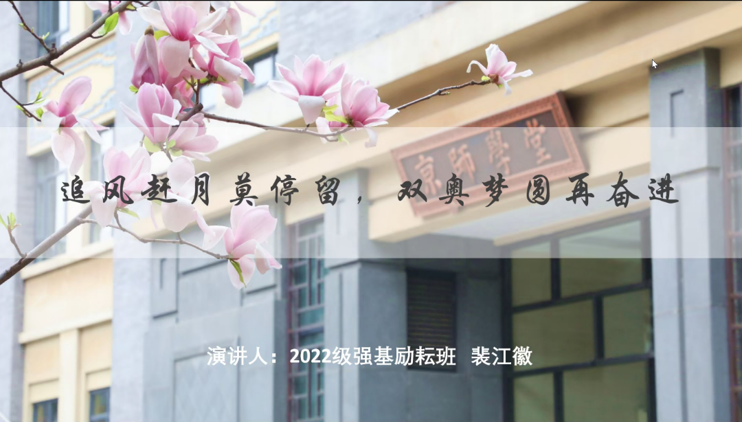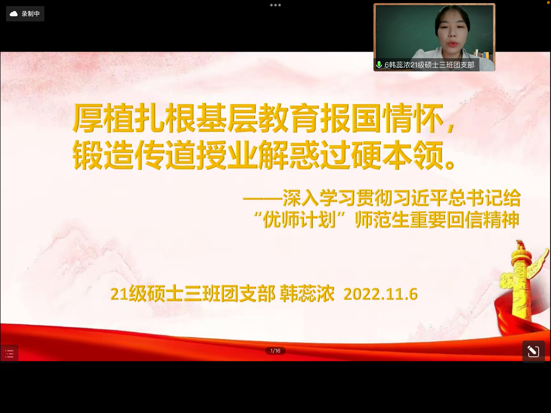 昭昭若日月之明,离离如星辰之行。21级硕士3班团支部的韩蕊浓同学以“厚植扎根基层教育报国情怀,锻造传道授业解惑过硬本领”为主题,说明教师是人类灵魂的工程师。韩蕊浓同学语速流畅自然,ppt 内容简洁明了,用直观的数字与师大人的实例解读“优师计划”,同时结合京师化学“优师计划”,展现了教育是国之大计,党之大计,师范是立教之本,兴教之源,呼吁同学们仰望星空,脚踏实地以抵达灵魂的翠草流芳之境。