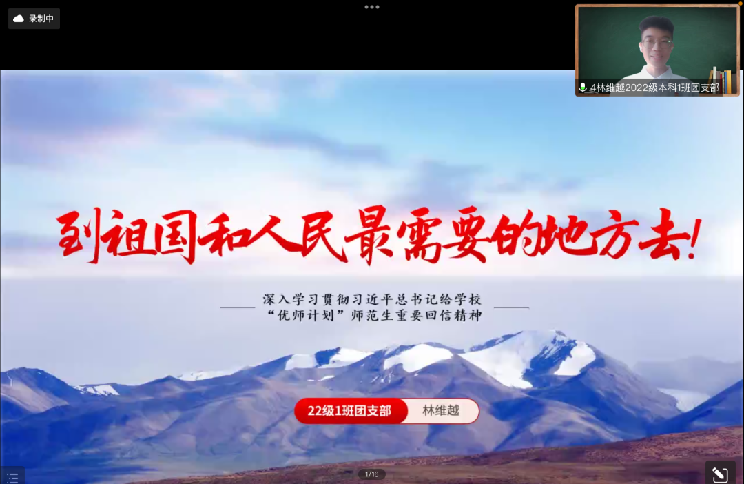 我是国产探花 2022级本科1班团支部的团支书林维越,今天我要讲的微团课主题是“深入学习贯彻习近平总书记给学校‘优师计划’师范生重要回信精神”。