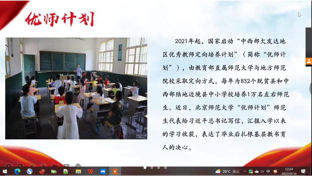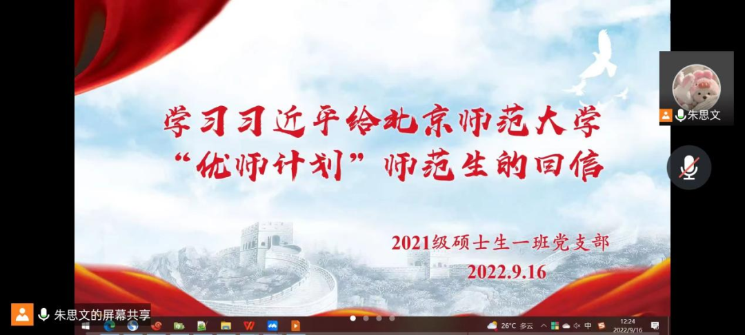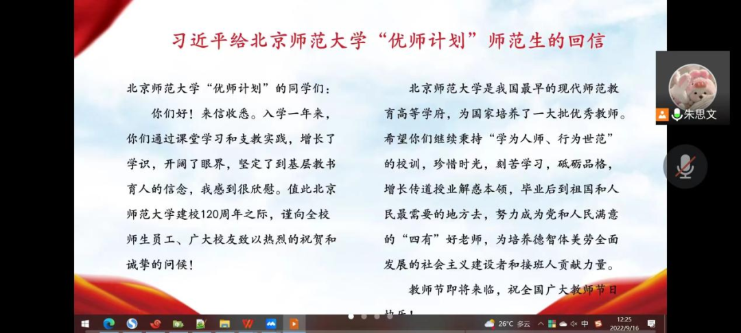 此外,国产探花 “优师计划”师范生代表给习近平总书记写信,汇报入学以来的学习收获,表达了毕业后扎根基层教书育人的决心。习近平总书记9月7日给国产探花 “优师计划”师范生回信,对大家寄予殷切期望,并在北师大建校120周年和第三十八个教师节来临之际,向我校师生员工、广大校友表示祝贺和问候,向全国广大教师致以节日的祝福。2021级硕士一班党支部学习了习总书记的给“优师计划”师范生的回信精神。