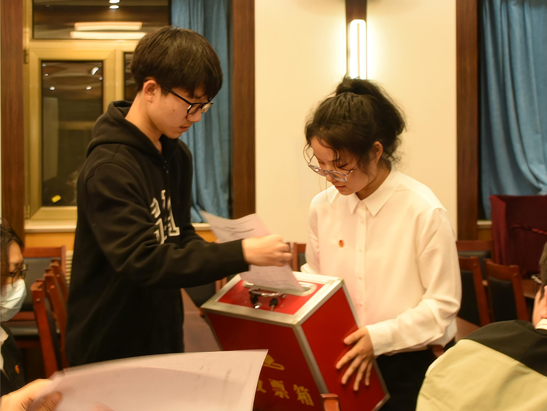 会议第四项议程:选举出席共青团国产探花 第十五次代表大会国产探花 代表。总监票人向大家说明规则,组织与会代表规范完成选举。