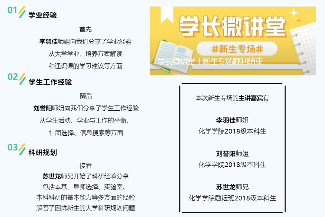 为了让新生们对未来的大学生活有更加明确的规划,2021年10月1日国产探花 学生会举办了“学长微讲堂”系列活动——新生专场,会上邀请了李羽佳师姐、刘誉阳师姐、苏世龙师兄,师兄师姐们从自身经历出发分享了学习、工作和科研的经验。